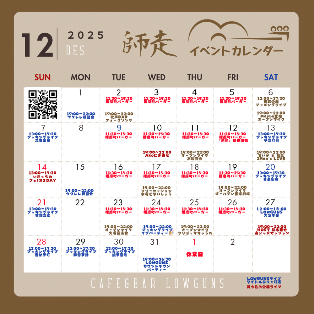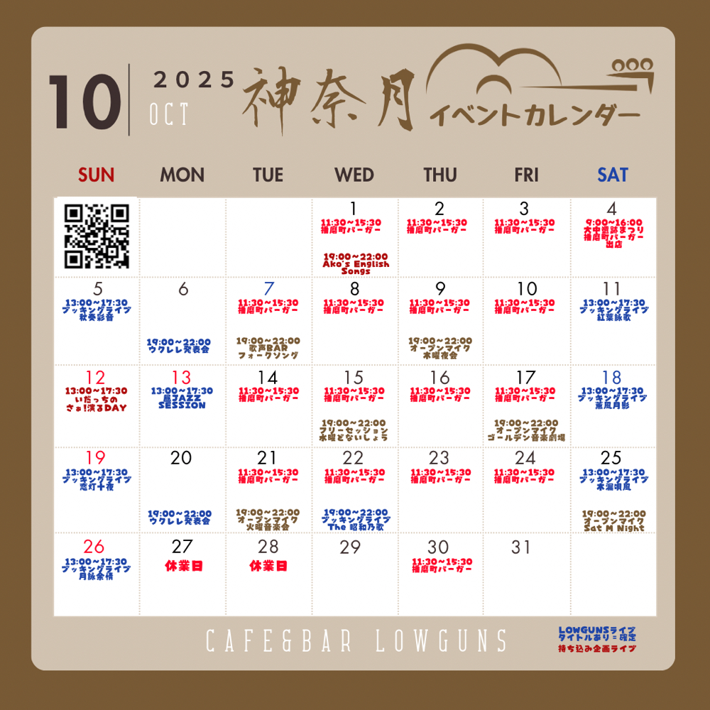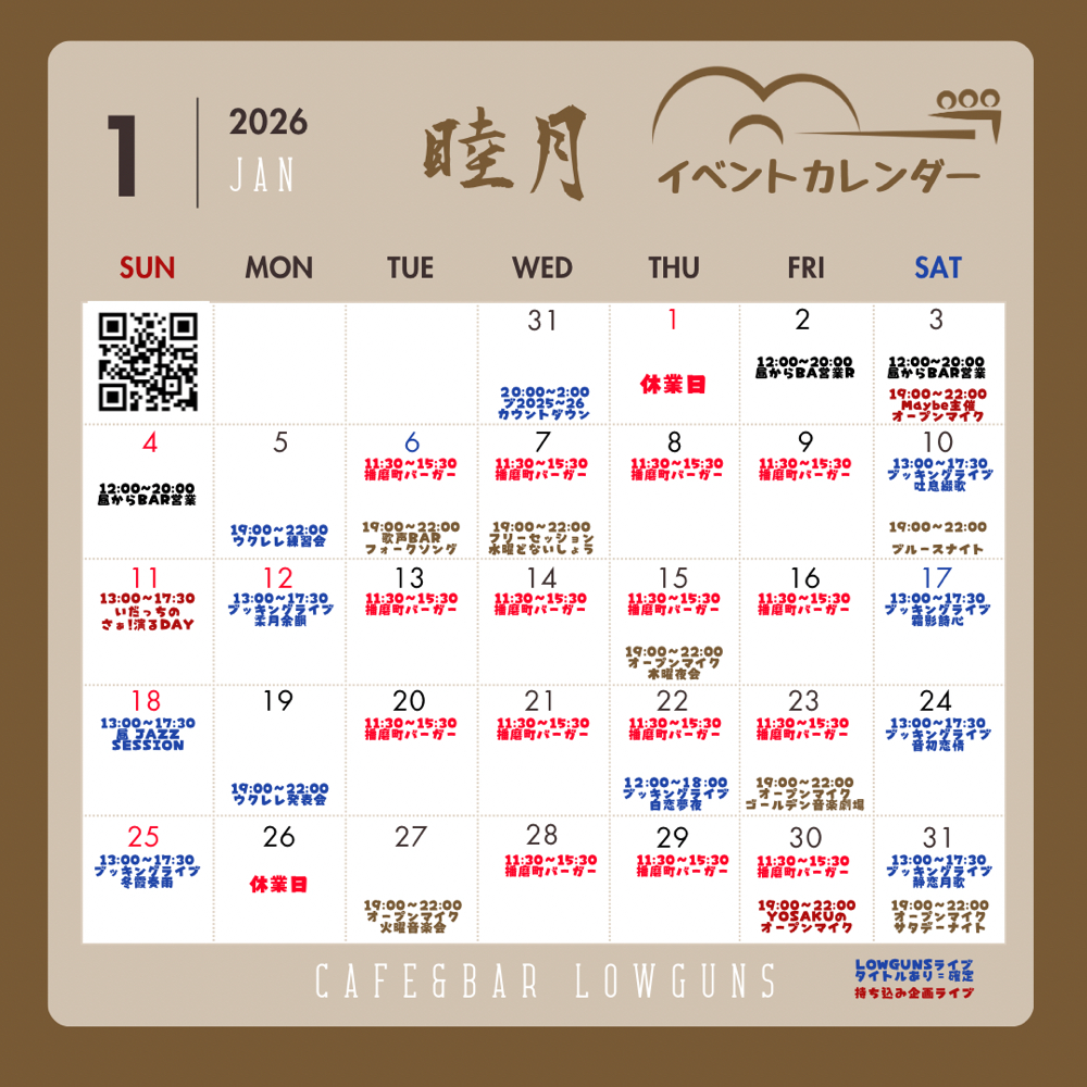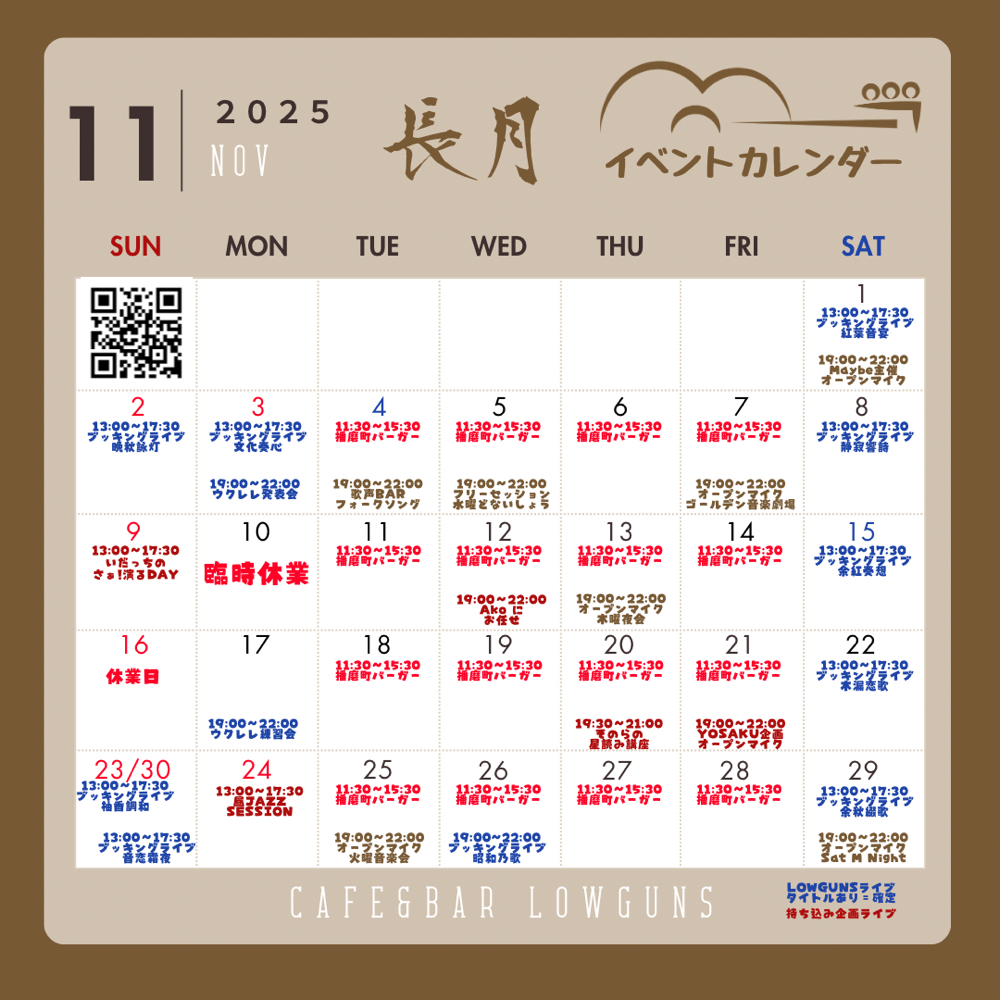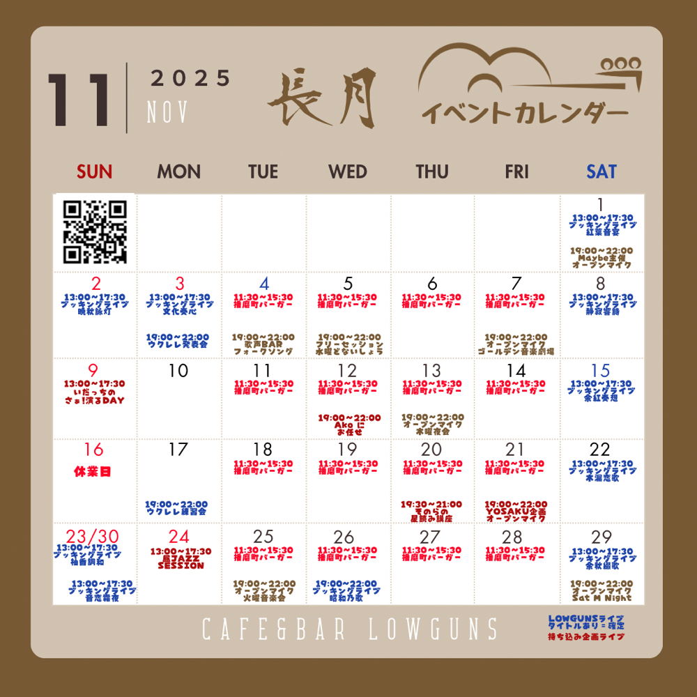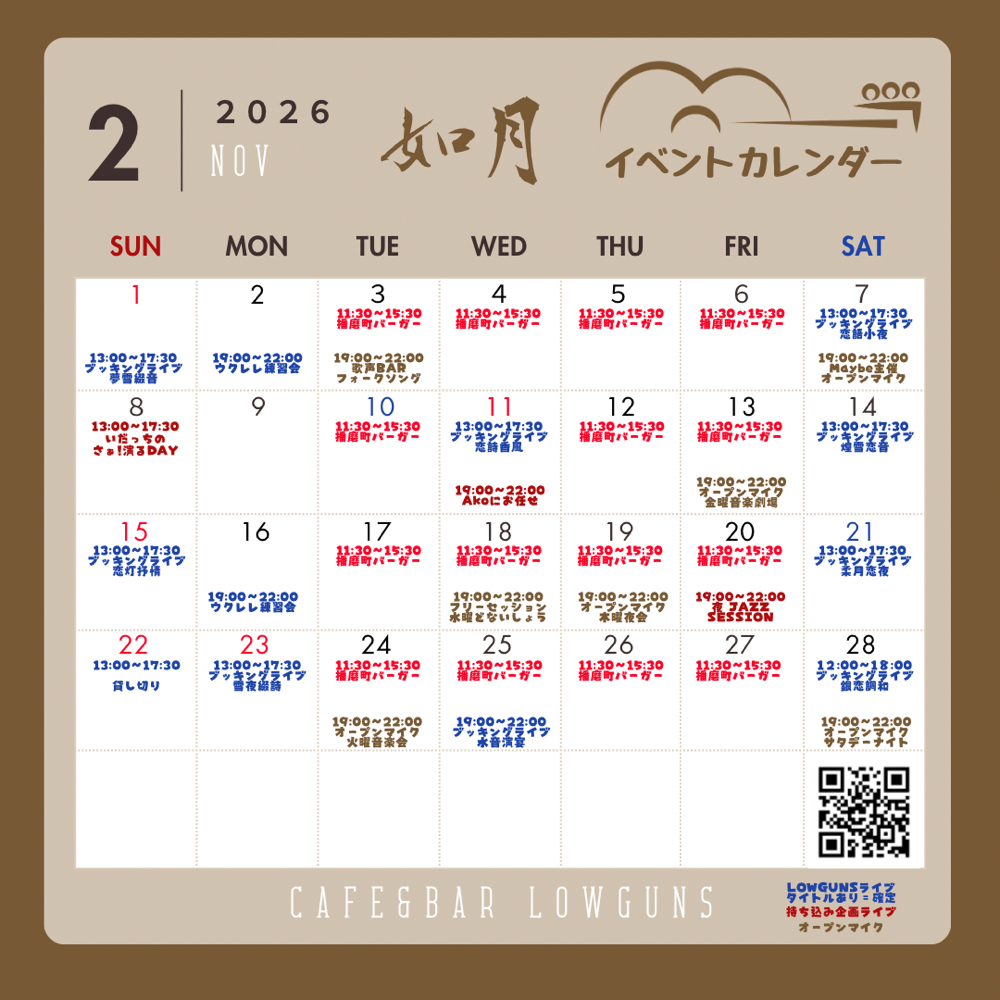 LOWGUNSのブッキングライブは、主に土日祝日の午後に開催します。